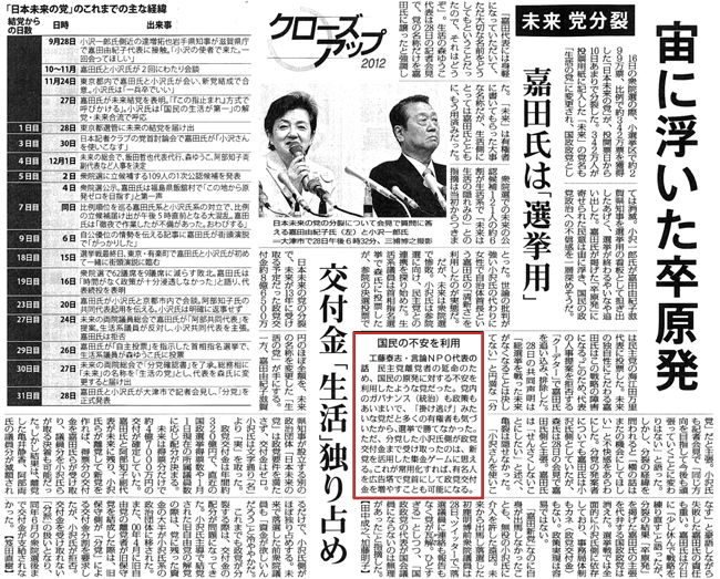 メディア掲載 【毎日新聞】宙に浮いた卒原発 "日本未来の党分裂" ― 国民の不安を利用 2012年12月29日 Facebookでシェア Twitterに投稿 メールで送る 印刷 entry_body=2012/12/29 毎日新聞 朝刊 3面 拡大する entry_more= 2012/12/29 毎日新聞 朝刊 3面 拡大する Facebookでシェア Twitterに投稿 メールで送る 印刷