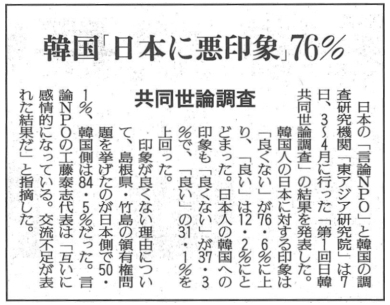 メディア掲載 【読売新聞】韓国「日本に悪印象」76% 共同世論調査 2013年5月09日 Facebookでシェア Twitterに投稿 メールで送る 印刷 entry_body=2013/05/08 読売新聞 朝刊2面 entry_more= 2013/05/08 読売新聞 朝刊2面 Facebookでシェア Twitterに投稿 メールで送る 印刷