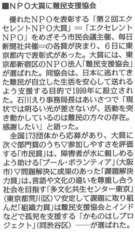 メディア掲載 【毎日新聞】NPO大賞に難民支援協会 2013年12月07日 Facebookでシェア Twitterに投稿 メールで送る 印刷 entry_body=2013/12/07 毎日新聞 朝刊27面 entry_more= 2013/12/07 毎日新聞 朝刊27面 Facebookでシェア Twitterに投稿 メールで送る 印刷