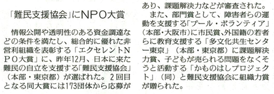 メディア掲載 【読売新聞】『難民支援協会』にNPO大賞 2014年1月14日 Facebookでシェア Twitterに投稿 メールで送る 印刷 entry_body=2014/01/14 読売新聞 朝刊16面 entry_more= 2014/01/14 読売新聞 朝刊16面 Facebookでシェア Twitterに投稿 メールで送る 印刷