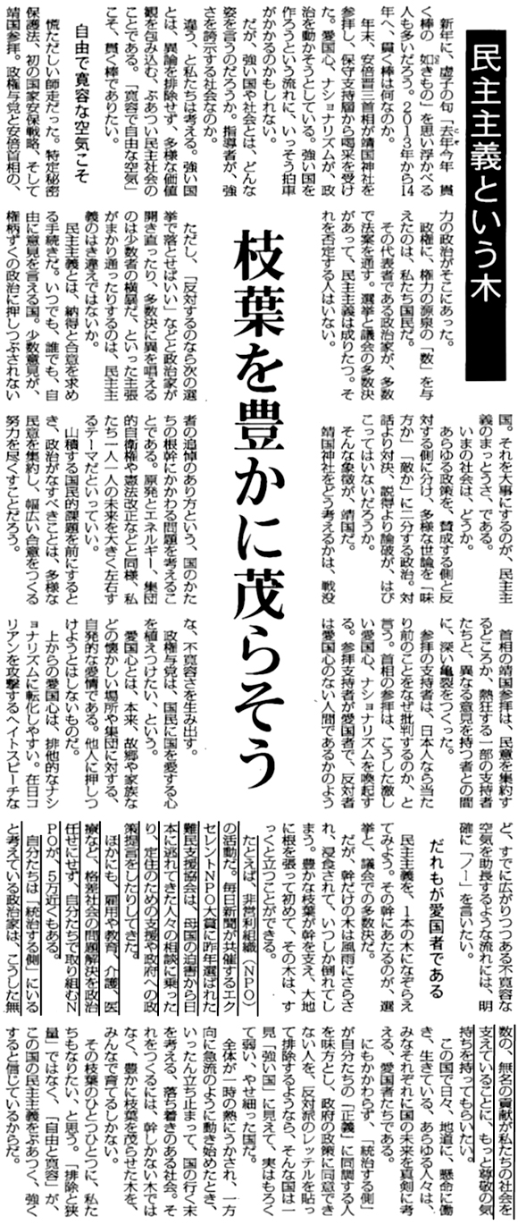 メディア掲載 【毎日新聞】社説 民主主義という木 枝葉を豊かに茂らそう 2014年1月01日 Facebookでシェア Twitterに投稿 メールで送る 印刷 entry_body=2014/01/01 毎日新聞 朝刊3面 entry_more= 2014/01/01 毎日新聞 朝刊3面 Facebookでシェア Twitterに投稿 メールで送る 印刷