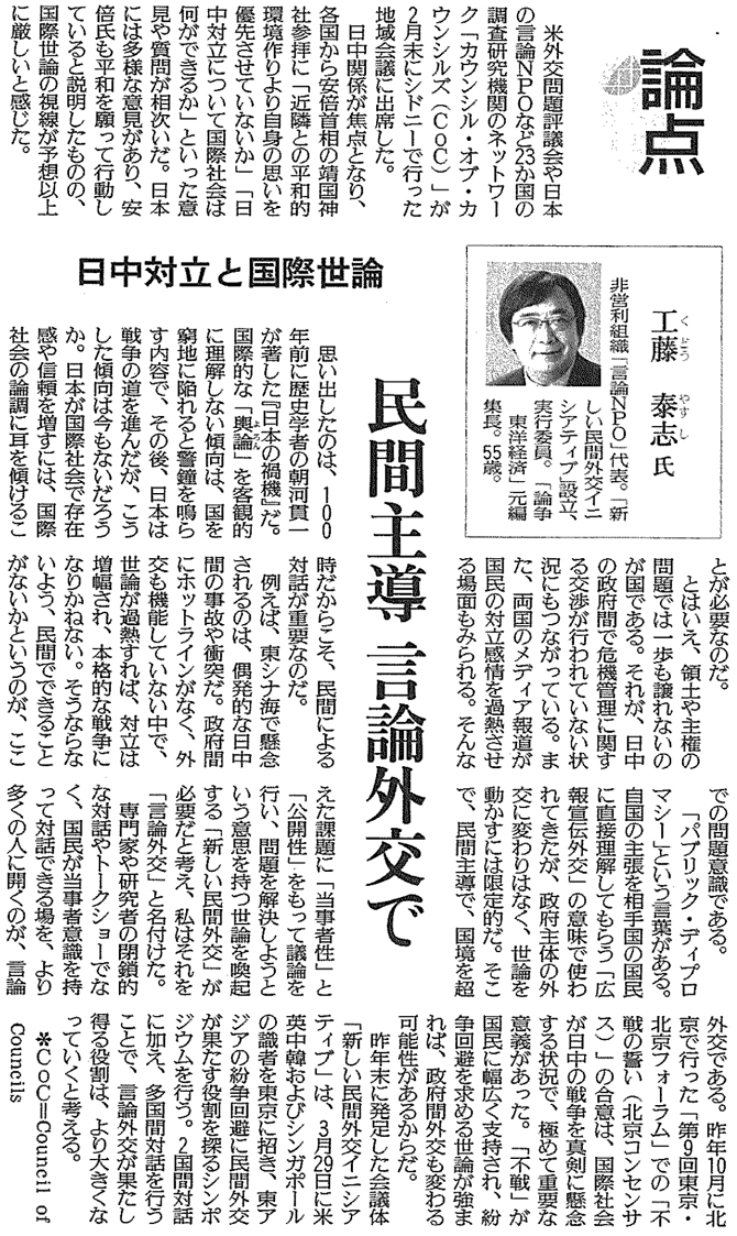 メディア掲載 【読売新聞】論点 日中対立と国際世論 民間主導 言論外交で 2014年3月20日 Facebookでシェア Twitterに投稿 メールで送る 印刷 entry_body=2014/03/19 読売新聞 朝刊11面 entry_more= 2014/03/19 読売新聞 朝刊11面 Facebookでシェア Twitterに投稿 メールで送る 印刷