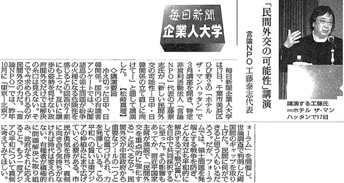 メディア掲載 【毎日新聞】毎日新聞企業人大学「民間外交の可能性」講演 2014年3月18日 Facebookでシェア Twitterに投稿 メールで送る 印刷 entry_body=2014/03/19 毎日新聞 朝刊18面 entry_more= 2014/03/19 毎日新聞 朝刊18面 Facebookでシェア Twitterに投稿 メールで送る 印刷