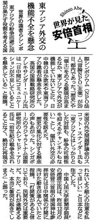 メディア掲載 【朝日新聞】世界が見た安倍首相 東アジア外交の機能不全を懸念 2014年3月31日 Facebookでシェア Twitterに投稿 メールで送る 印刷 entry_body=2014/03/30 朝日新聞 朝刊7面 entry_more= 2014/03/30 朝日新聞 朝刊7面 Facebookでシェア Twitterに投稿 メールで送る 印刷
