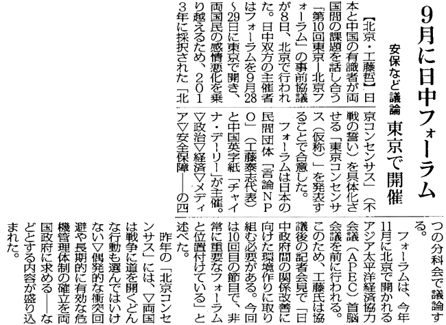 メディア掲載 【読売新聞】【毎日新聞】9月に日中フォーラム 安保など議論 東京で開催 2014年6月10日 Facebookでシェア Twitterに投稿 メールで送る 印刷 entry_body=2014/06/10 毎日新聞 朝刊9面 2014/06/10 読売新聞 朝刊7面 entry_more= 2014/06/10 毎日新聞 朝刊9面 2014/06/10 読売新聞 朝刊7面 Facebookでシェア Twitterに投稿 メールで送る 印刷