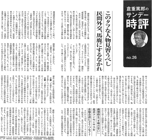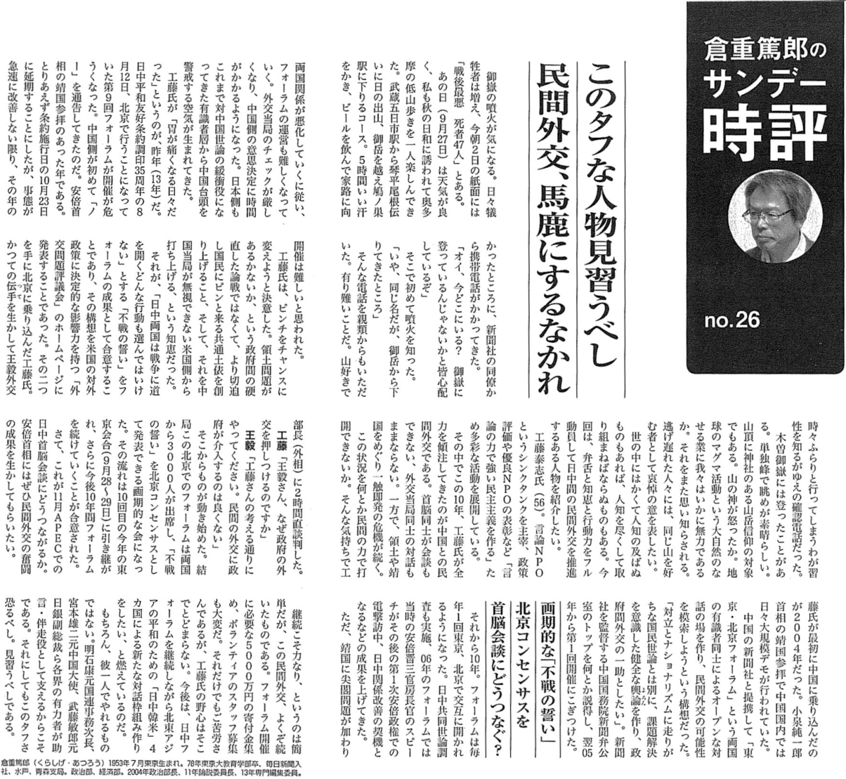 メディア掲載 【サンデー毎日】倉重篤郎のサンデー時評 このタフな人物見習うべし 民間外交、馬鹿にするなかれ 2014年10月09日 Facebookでシェア Twitterに投稿 メールで送る 印刷 entry_body=サンデー毎日 2014年10月19日号、pp.38-39 拡大する entry_more= サンデー毎日 2014年10月19日号、pp.38-39 拡大する Facebookでシェア Twitterに投稿 メールで送る 印刷