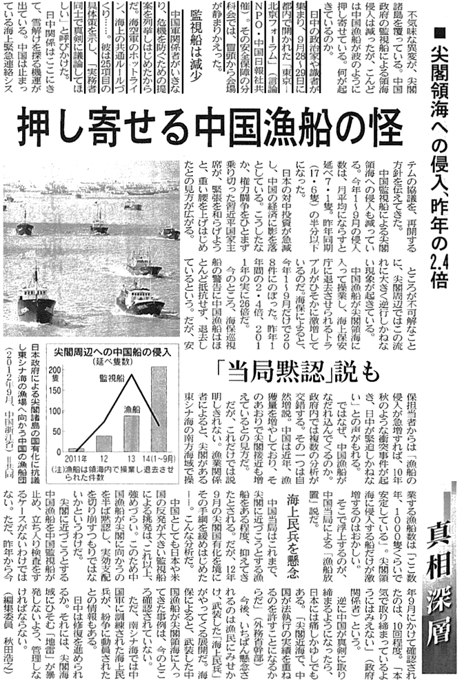 メディア掲載 【日本経済新聞】真相深層 押し寄せる中国漁船の怪『当局黙認』説も 2014年10月10日 Facebookでシェア Twitterに投稿 メールで送る 印刷 entry_body=2014/10/10 日本経済新聞 朝刊2面 entry_more= 2014/10/10 日本経済新聞 朝刊2面 Facebookでシェア Twitterに投稿 メールで送る 印刷