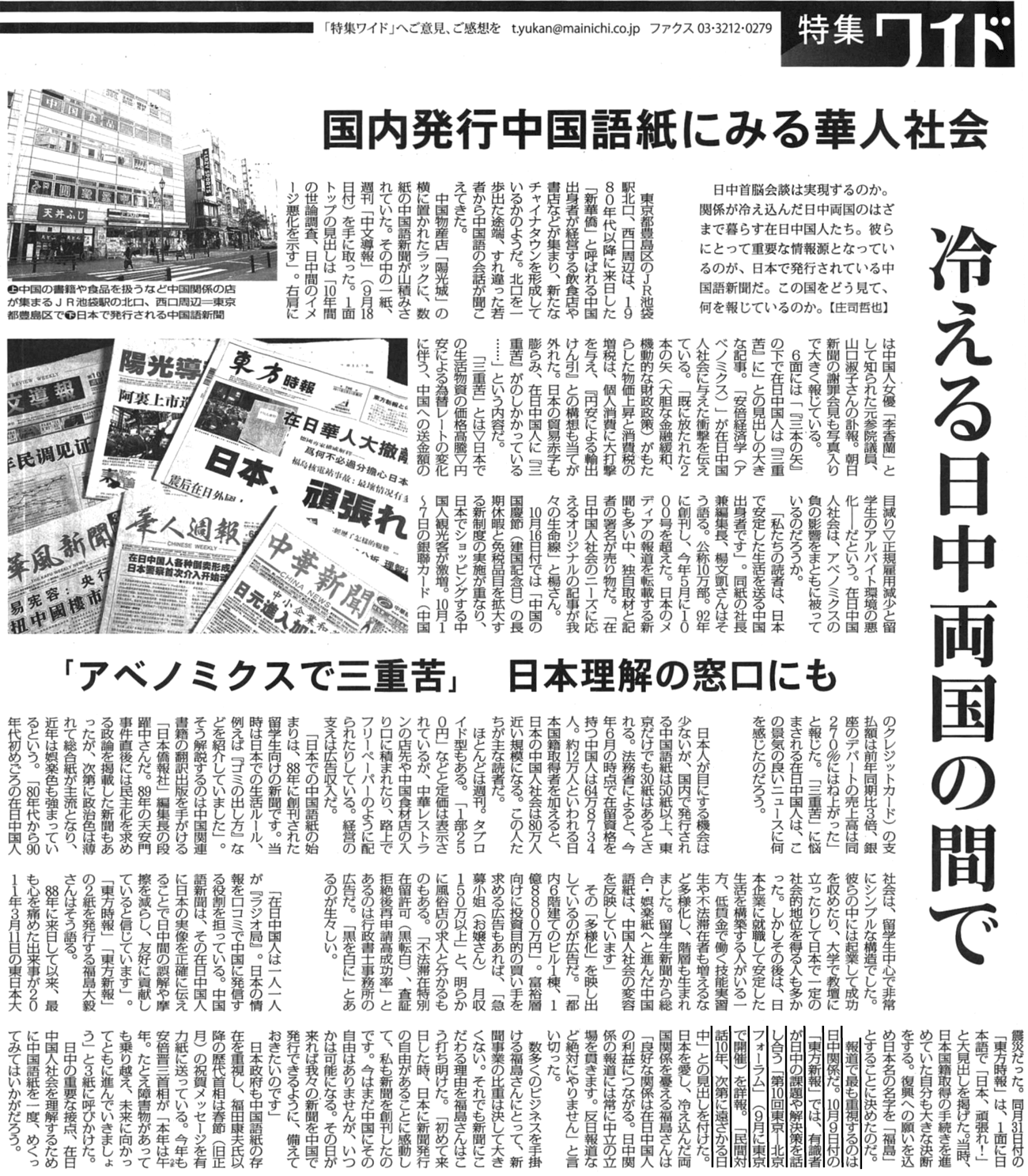 メディア掲載 【毎日新聞】国内発行中国語紙にみる華人社会 2014年10月29日 Facebookでシェア Twitterに投稿 メールで送る 印刷 entry_body=2014/10/29 毎日新聞 夕刊2面 拡大する entry_more= 2014/10/29 毎日新聞 夕刊2面 拡大する Facebookでシェア Twitterに投稿 メールで送る 印刷