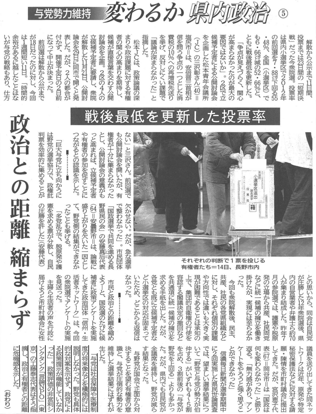 メディア掲載 【信濃毎日新聞】「戦後最低を更新した投票率 政治との距離 縮まらず 2014年12月21日 Facebookでシェア Twitterに投稿 メールで送る 印刷 entry_body=2014/12/21 信濃毎日新聞 朝刊2面 拡大する entry_more= 2014/12/21 信濃毎日新聞 朝刊2面 拡大する Facebookでシェア Twitterに投稿 メールで送る 印刷