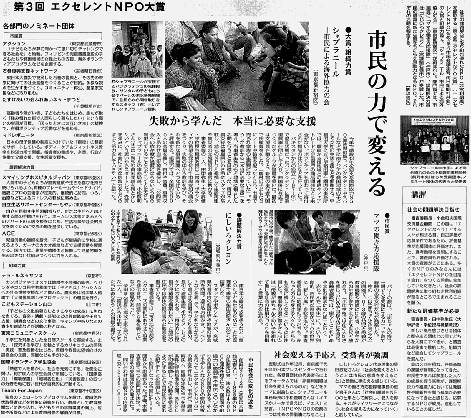 メディア掲載 【毎日新聞】第3回エクセレントNPO大賞 市民の力で変える 2015年1月29日 Facebookでシェア Twitterに投稿 メールで送る 印刷 entry_body=2015/01/29 毎日新聞 朝刊13面 拡大する entry_more= 2015/01/29 毎日新聞 朝刊13面 拡大する Facebookでシェア Twitterに投稿 メールで送る 印刷