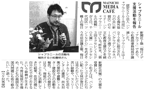 メディア掲載 【毎日新聞】エクセレントNPO大賞受賞団体、シャプラニールが講演会を開催 2015年2月04日 Facebookでシェア Twitterに投稿 メールで送る 印刷 entry_body=2015/02/04 【毎日新聞】 朝刊23面 entry_more= 2015/02/04 【毎日新聞】 朝刊23面 Facebookでシェア Twitterに投稿 メールで送る 印刷