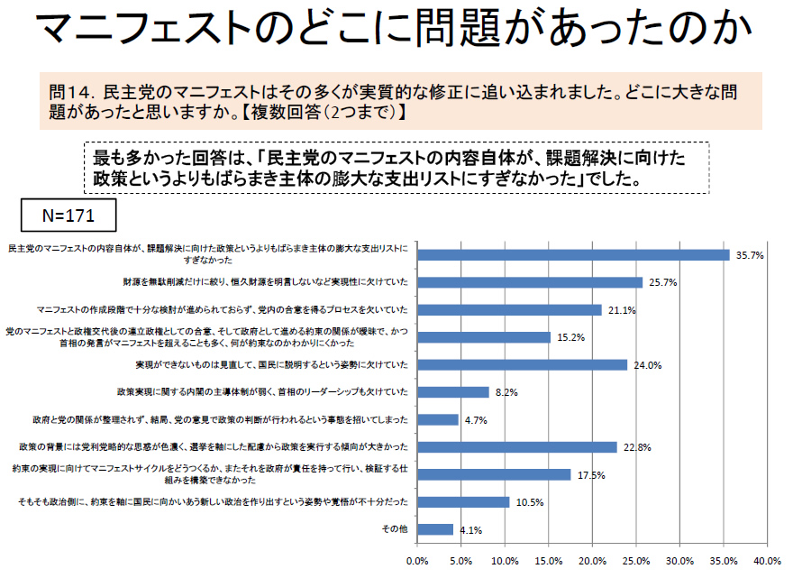 日本政治がこうした状況にも関わらず、一方では有識者の69%が、国民との約束を軸としたマニフェスト型の政治を目指すことに賛成しています。そうした認識が多数を占める中で、昨年秋の総選挙で掲げた民主党のマニフェストの多くが事実上の修正に追い込まれた原因を問う設問では、「民主党のマニフェストの内容自体が、課題解決に向けた政策というよりもばらまき主体の膨大な支出リストにすぎなかった」が38.7%で最も多く、「財源を無駄削減だけに絞り、恒久財源を明言しないなど実現性に欠けていた」(25.7%)、「実現ができないものは見直して、国民に説明するという姿勢にかけていた」(24.0%)が続きました。