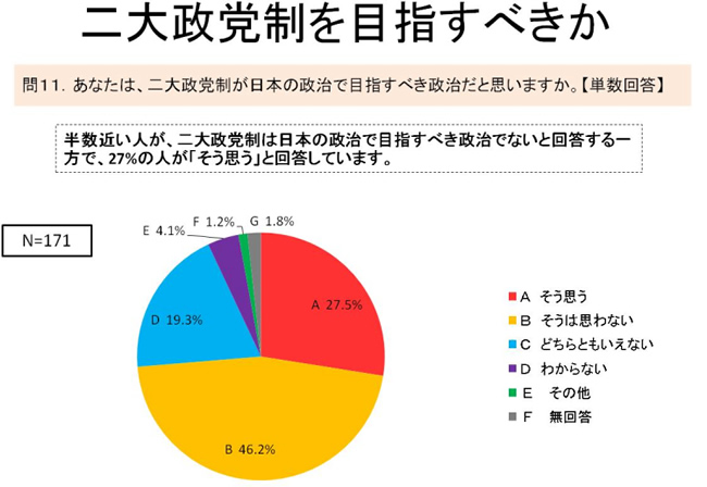 今回の有識者アンケートでは、まず日本の政党政治のあり方や政治の現状について尋ねています。第一に、二大政党制が日本の政治が目指すべき政治なのか、という問いに関しては、「そう思わない」と答えた人は46.2%と半数に近づき、「そう思う」の27.5%を大きく引き離しました。