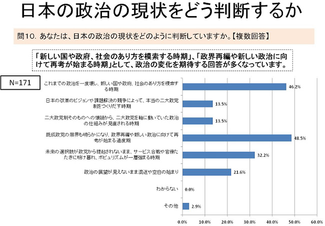 その上で、政治の現状をどう見るか、に関しては、「既成政党の限界も明らかになり、政界再編や新しい政治に向けて再考が始まる時期」が48.5%、「これまでの政治を一度壊し、新しい国や政府、社会のあり方を模索する時期」が46.2%とそれぞれ半数近くになっており、そのため、日本に期待する政権の姿として、31.6%が「期待する政治の姿が見えない」と答えています。
