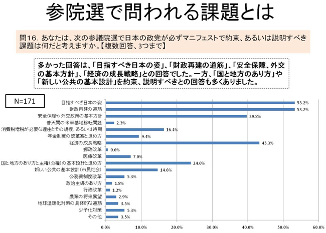 そして、今度の参議院選挙で問われるべき課題に関しては、53.2%が「日本の目指すべき姿」「財政再建の道筋」をそれぞれ選んでおり、「経済成長」(43.3%)と「安全保障と外交政策の基本方針」(39.8%)がそれに続いています。