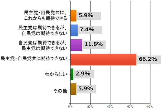 ○民主党は政治のプロ集団とは思えず全く期待できない。自民党がこれまでしてきたことに対し批判もあるが、長年与党であったため政治家集団として国を動かすことのプロが多いように思う。野党を経験した若手議員が結束し、この国の未来を少しでも良くしていこうとするならば、現政権より実現性があると考える。(50代、主婦)