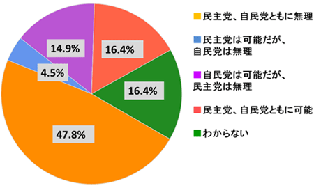 ○民主党、自民党とも本心は無理と思っているが、こう云ってしまったら日本国は沈没してしまうので民主党に敢えて期待したい。前提として小沢問題に決着をつけることが先決。政界の本当の姿が我々一般人にはよく分からないし、極端に言えば全ての情報が信用できないところに来ている。これは政界だけでなく、法曹界まで信用できなくなってきていて由々しき問題です。こんなときだからこそ、この言論NPOの存在などが大事になってくるが、100%の信用には?マークがつく。何故か自分じゃないからである。このように不審が渦巻いている状態でも、日本は大事な我々の国だから信用できる国にするために敢えて「民主党は可能だが、自民党は無理」にチエックをつけた。(70代、その他・退職。年金受給者)