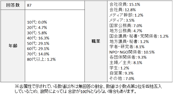 言論NPOの活動にこれまで参加していただいた全国の有識者約2000人を対象に、2012年10月24日から25日にかけてアンケートの回答を依頼し、回答のあった87人の回答内容を分析した。