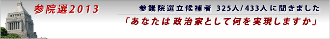 日本の課題を考える 候補者アンケート_2013年参院選 2013年参議院選挙 候補者アンケート 2013年7月17日 Facebookでシェア Twitterに投稿 メールで送る 印刷 実施したアンケートはこちら / 分析結果はこちら 北海道 青森 秋田 岩手 山形 宮城 石川 富山 新潟 福島 長崎 佐賀 福岡 山口 島根 鳥取 兵庫 京都 滋賀 福井 長野 群馬 栃木 茨城 熊本 大分 広島 岡山 大阪 奈良 岐阜 山梨 埼玉 千葉 鹿児島 宮崎 和歌山 三重 愛知 静岡 神奈川 東京 愛媛 香川 沖縄 高知 徳島 比例区のアンケート結果はこちら 自民 / 公明 / 民主 / 日本維新の会 / みんなの党 / 共産 / 社民 生活の党 / みどりの風 / みどりの党 / 幸福実現党 / 新党大地 Facebookでシェア Twitterに投稿 メールで送る 印刷