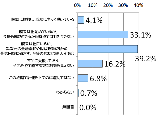 - これからは民間(企業)の出番だというが、右肩上がりでない状況で民間が出やすいような条件作り(規制改革ほか)や呼び水政策が必要。本アンケートの設問についての私の意見を以下述べます。 私は、アベノミクスのポイントは「失われた20年」といわれた状態を脱し、日本経済を成長軌道に乗せることであると考えています。したがって、名目成長、実質成長、物価上昇についての数値目標をそのとおり実現できるかどうかが評価基準であるとは考えません。アベノミクスは三つの矢から成っていて、第1と第2の矢により、デフレ現象に終止符が打たれ、日本経済に明るさが戻りつつあることは確かですが、問題は第3の矢であり、日本経済が成長軌道に乗るような施策が示されていると言えるのか、どのような施策が必要かといった点にこそ焦点を絞り、議論すべきであると思います。この問題は、構造改革を伴う中長期の問題であり、景気動向という短期の問題と混同することを避ける必要があります。(男、70代、各団体関係者)