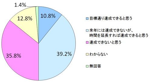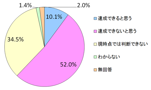 問5.政府と日本銀行は2013年1月22日、デフレ脱却のために「2%」の物価上昇率の目標を盛り込んだ共同声明を公表しました。さらに同年4月4日、日銀の黒田東彦総裁は、その達成期限に関して「2年程度の期間を念頭に置いて、できるだけ早期に実現する」と表明し、量的・質的金融緩和を導入しました。来年2015年には「2年」を迎えますが、あなたはこの物価目標を達成できると思いますか。【単数回答】