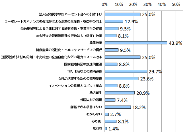 - "評価している"という意味が、(成果はともかく、打ち出したということについての評価なら) ・国家戦略特区の加速的推進 ・女性が活躍するための環境整備 (出ている成果、進め方についての評価なら) ・農業改革 ・地方創生(男、40代、NPO・NGO関係者)