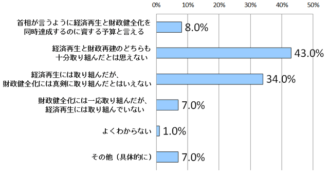 一方、首相が言うように「経済再生と財政健全化に同時達成するのに資する予算と言える」との評価は8.0%と1割未満でした。