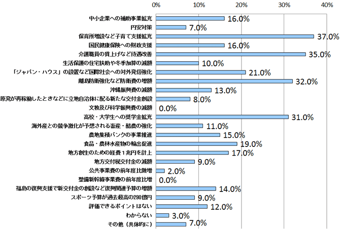 次に、今回の予算案の中で、評価しているポイントを尋ねました。その結果、「保育所増設など子育て支援拡充」(37.0%)、「介護職員の賃上げなど待遇改善」(35.0%)と社会保障関連の歳出が上位を占めました。これに「離島防衛強化など防衛費の増額」(32.0%)と「高校・大学生への奨学金拡充」(31.0%)が続き、ここまでが3割を超えました。安倍政権が力を入れている「地方創生」のために経費1兆円を計上したことを挙げた回答は17.0%と2割足らずにとどまりました。