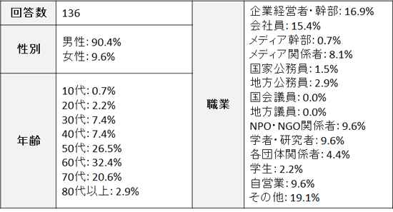 言論NPOは、「原発再稼働を含めた日本のエネルギー政策を考える」と題して、有識者を対象にアンケート調査を行いました。調査は言論NPOの活動にこれまで参加していただいた全国の有識者約6000人を対象に、2015年3月29日から3月30日の期間でアンケートの回答を依頼し、回答のあった136人の回答内容を分析しました。