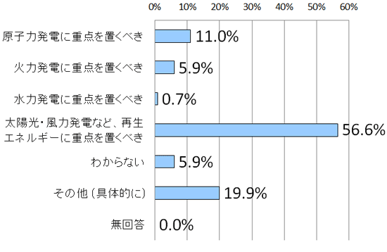 今後の日本の将来のエネルギーの供給体制を考えた場合、どのようなエネルギーに重点を置くべきかを尋ねたところ、「太陽光・風力発電など、再生エネルギーに重点を置くべき」(56.6%)との回答が最多となり半数を超えた。一方、「原子力発電に重点を置くべき」との回答は11.0%にとどまった。