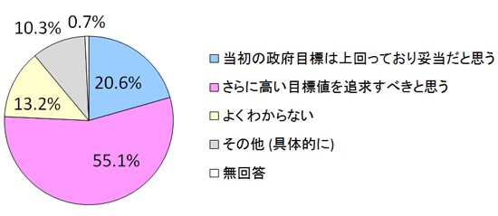 こうした状況を踏まえつつ、経産省が示した再生可能エネルギーの比率についての評価を尋ねたところ、「さらに高い目標を追求すべきと思う」との回答が55.1%と最多となり、「当初の政府目標は上回っており妥当だと思う」との回答は20.6%を大きく上回り、更なる意欲的な数字を目標に掲げるべきとの回答が半数を超えました。