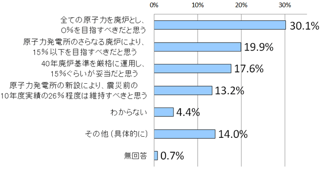 発電所の「40年廃炉基準」を厳格に運用した場合、2030年末の時点では現存する48基のうち30基の原子力発電設備が廃炉となり、新規を前提としない場合、2030年の原子力依存度は15%程度(2010年の実績26%)にとどまることになります。そこで、2030年の原子力発電における日本のエネルギーの供給比率はどの程度だと考えているか尋ねたところ、「全ての原子力を廃炉とし、0%を目指すべき」との回答が30.1%となり、原子力発電は無くすべきとの回答が多数となった。