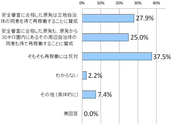 最後に、原子力発電所の再稼働について尋ねたところ、「そもそも再稼働には反対」(37.5%)との回答が最多となりました。一方で、再稼働には賛成との回答は「安全審査に合格した原発は立地自治体の同意を得て再稼働することに賛成」(27.9%)、「安全審査に合格した原発も、原発から30キロ圏内にある周辺自治体の同意も得て再稼働することに賛成」(25.0%)を併せると、52.9%と半数を超えました。
