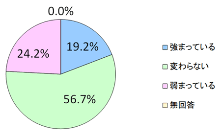 2011年3月11日から4年が経ち、東日本大震災からの復興への関心について尋ねたところ、「変わらない」との回答が56.7%で最多となり、「強まっている」との回答(19.2%)と合わせると、65.9%の有識者が東日本大震災に変わらず関心を寄せていることが分かります。