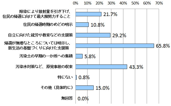 福島第一原発事故による放射線の影響により復興が遅れている福島ですが、福島が復興するために必要なことは何かを尋ねました。最多となったのは「帰還が無理なところについては明示し、新生活の基盤づくりに向けた支援策」(65.8%)との回答で、6割を超す人が選択ました。続いて「汚染水対策など、原発事故の収束」(43.3%)、「自立に向けた終了や教育などの支援策」(29.2%)、「除染により放射線量を引き下げ、住民の帰還に向けて最大限努力すること」(21.7%)が続きます。
