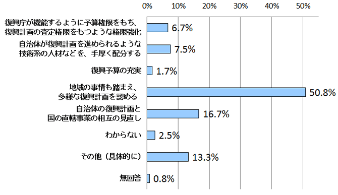 2015年度は5年間の集中復興期間の最終年度となります。一方で、政府は次の5年間の支援の枠組みを今夏までに策定することを明らかにしています。そこで、次の5年間の復興政策において必要なことは何かを尋ねたところ、他の回答を大きく引き離し、50.8%の人が「地域の事情も踏まえ、多様な復興計画を認める」と回答しました。「自治体の復興計画と国の直轄事業の相互の見直し」が16.7%と続くなど、従前の復興計画では今後の復興が見えないとの認識が広がっていることが分かります。