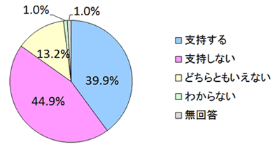 発足して約3年が経過した安倍政権を支持するか尋ねたところ、「支持する」が39.9%、「支持しない」が44.9%となっています。「支持する」と答えた人の割合は100日時点での53.1%から1年時点では41.4%、さらに2年時点では34.6%へと大きく低下していましたが、3年目ではやや持ち直しました。一方、「支持しない」という回答は44.9%で、2年目時点での49.8%から減少しました。