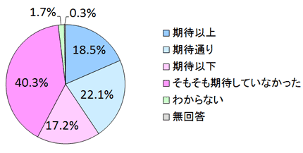 しかし、これに対して「期待する」見方も増えており、「期待以上」との回答は、18.5%で、2年時点での11%から大きく増えました(100日時点は42.9%、1年時点では20.8%)「期待以下」も17.2%と、2年時点での25.7%から減少しました。