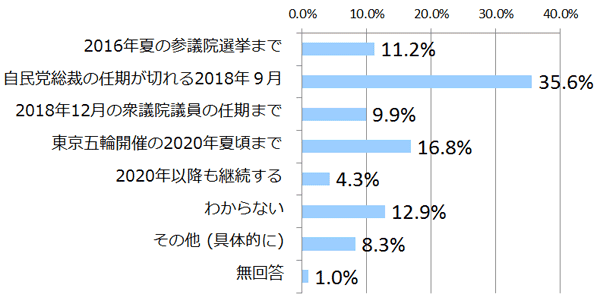 「安倍政権がいつまで続くと思うか」と質問したところ、最も多かった回答は「自民党総裁の任期が切れる2018年9月」の35.6%で、「2018年12月の衆議院の任期まで」が9.9%でした。しかし、「東京五輪開催の2020年夏頃まで」の16.8%、「2020年以降も継続する」の4.3%を合わせると21.1%となり、1年前に言論NPOが行った有識者アンケートで「2018年の衆議院議員の任期満了以降も続く」と答えた人の割合(11.3%)の約2倍となります。1年前に最も多かった回答は、「2018年の衆議院議員の任期満了までは続かない」で39.9%だったことも踏まえて考えると、安倍政権が長期化するという見通しが高まっていることが分かります。
