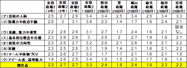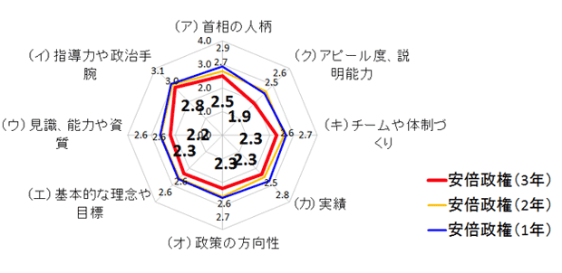 ただ、安倍政権の昨年の政権2年時点とを比較すると、「国民に対するアピール度、説明能力」が昨年の2.6点から1.9点に、また「首相としての見識、能力や資質」が2.6点から2.2点と大きく低下しています。