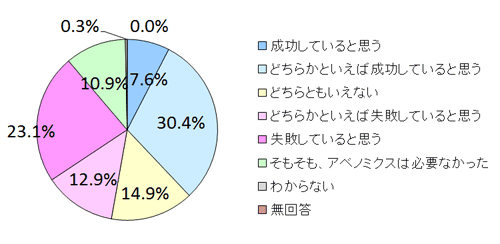 アベノミクスの現状への評価を尋ねたところ、「成功していると思う」と「どちらかといえば成功していると思う」を合わせた割合は38.0%でしたが、「どちらかと言えば失敗していると思う」「失敗していると思う」の合計も36.0%と、評価は二分していることがわかります。「そもそも、アベノミクスは必要なかった」という回答も約1割ありました。