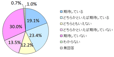 医療や介護など、高齢化社会に伴う新しい課題に対して、安倍政権が「解決に向けた方向性や解決策を打ち出すことに期待しているか」と尋ねました。「期待している」は「どちらかといえば期待してる」を加えて42.5%ありました、「期待していない」も、「どちらかといえば期待していない」を合わせると43.5%あり、有識者の間の意見は二分されています。