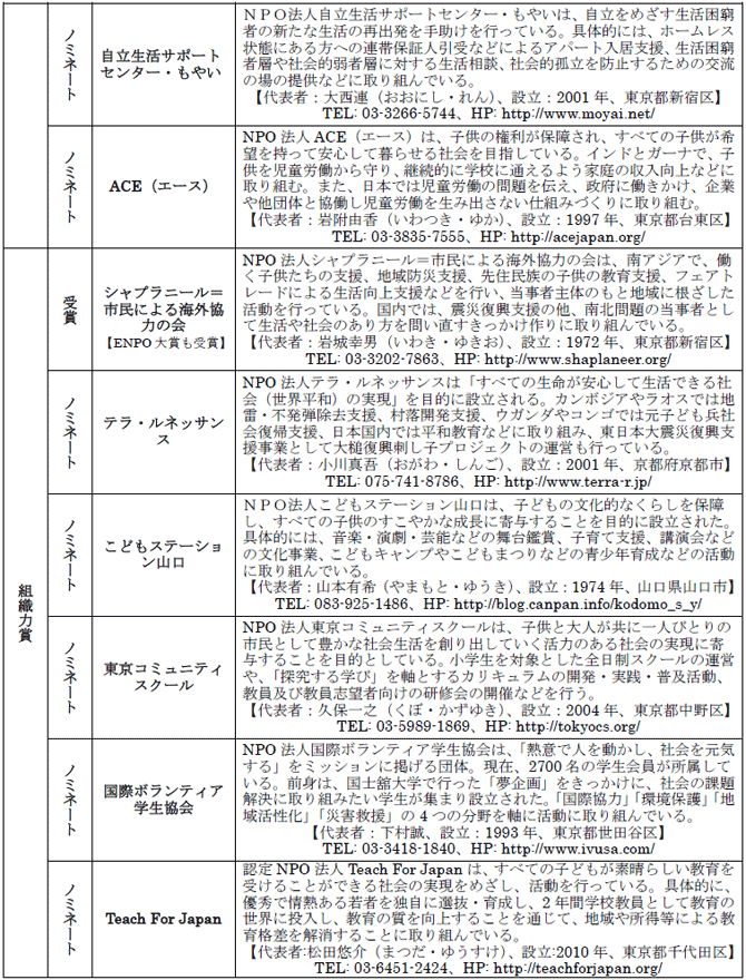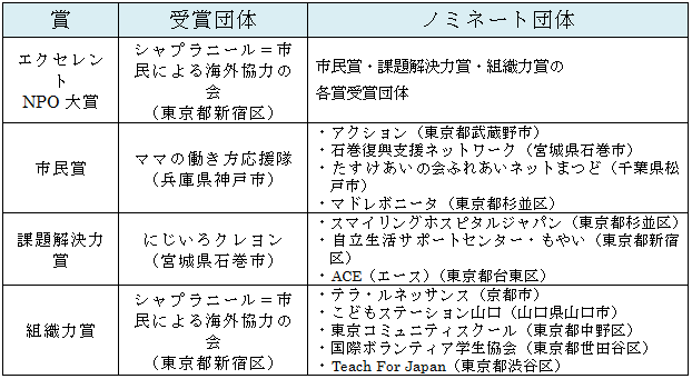 今年のエクセレントNPO大賞には、40年以上にわたり南アジアで働く子供たちの支援や地域防災支援などを行っている「シャプラニール=市民による海外協力の会」(東京都新宿区)が選ばれました。市民賞には赤ちゃんの力を使い無縁社会の解消に取り組む「ママの働き方応援隊」(神戸市)、課題解決力賞には被災地で子どもストレスケアに取り組む「にじいろクレヨン」(宮城県石巻市)、組織力賞には、大賞を受賞した「シャプラニール=市民による海外協力の会」が選ばれています。