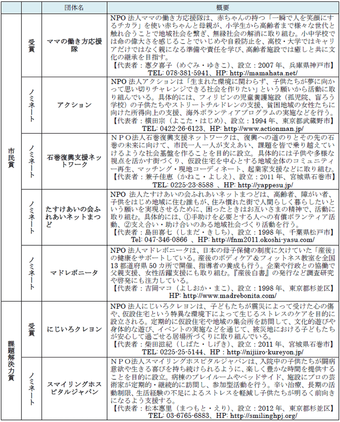 第3回の応募には、全国から106もの団体から応募がありました。この中から市民賞・課題解決力賞・組織力賞の各賞から15団体がノミネートされ、各賞受賞団体および大賞受賞団体が決定いたしました。ノミネート団体については、下記をご覧ください。各組織の概要については、5ページ目より紹介しております。