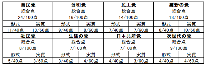 自民党が最高点を取るも、わずか24点(100点満点中)、その他の政党は10点台やそれ以下となる厳しい結果になりました。