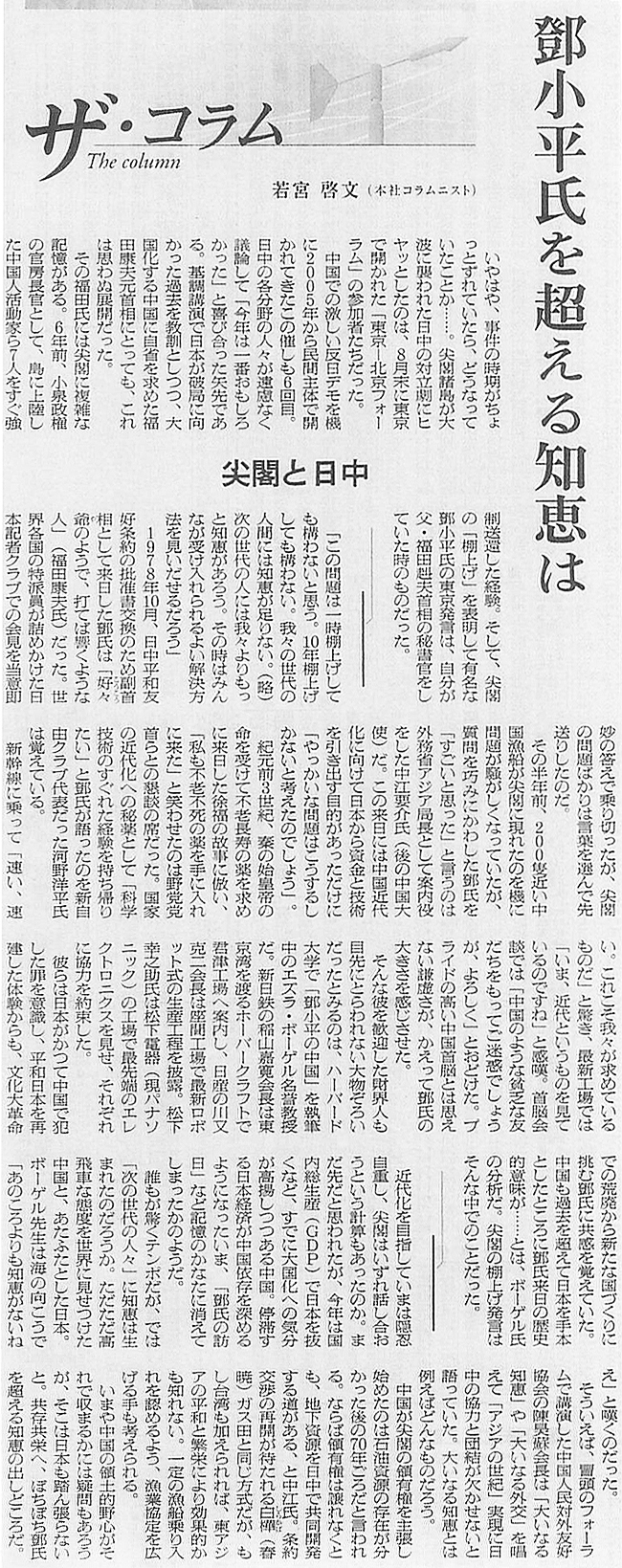 若宮啓文氏(朝日新聞社コラムニスト)の『ザ・コラム「鄧小平氏を超える知恵は」』(10月13日付朝日新聞朝刊)で「第6回 東京-北京フォーラム」が取り上げられました。
