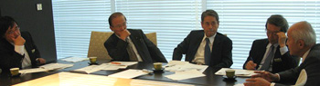 「第5回北京‐東京フォーラム」の分科会「経済対話」に向けた事前打ち合わせは22日、工藤泰志(言論NPO代表)の他、パネリストの小島明氏(日本経済研究センター特別顧問)、田波耕治氏(株式会社三菱東京UFJ銀行顧問)、福川伸次氏(財団法人機械産業記念事業財団会長)、武藤敏郎氏(株式会社大和総研理事長)が出席し、都内で行われました。