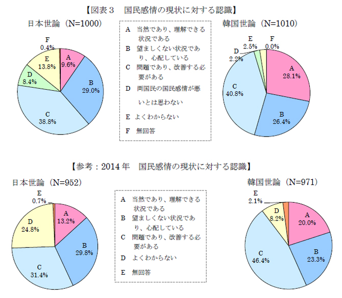 しかし、日本国民の67.8%、韓国国民の67.2%が日韓両国の関係が悪い状況に対して「望ましくない」、「問題であり、改善すべき」という認識を持っており、明るい材料があることもわかりました。