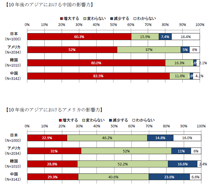 アジアにおける中国の影響力がこの10年でさらに増加すると見る国民は、当の中国で82.5%、さらに韓国も80%と8割を越え、日本は60.3%、米国でも52%と半数を越えている。