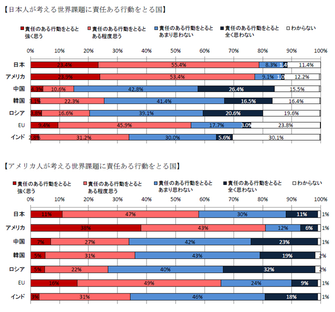 世界の中で責任有る行動が取れる国への評価では、日米と、中韓に温度差が大きい
